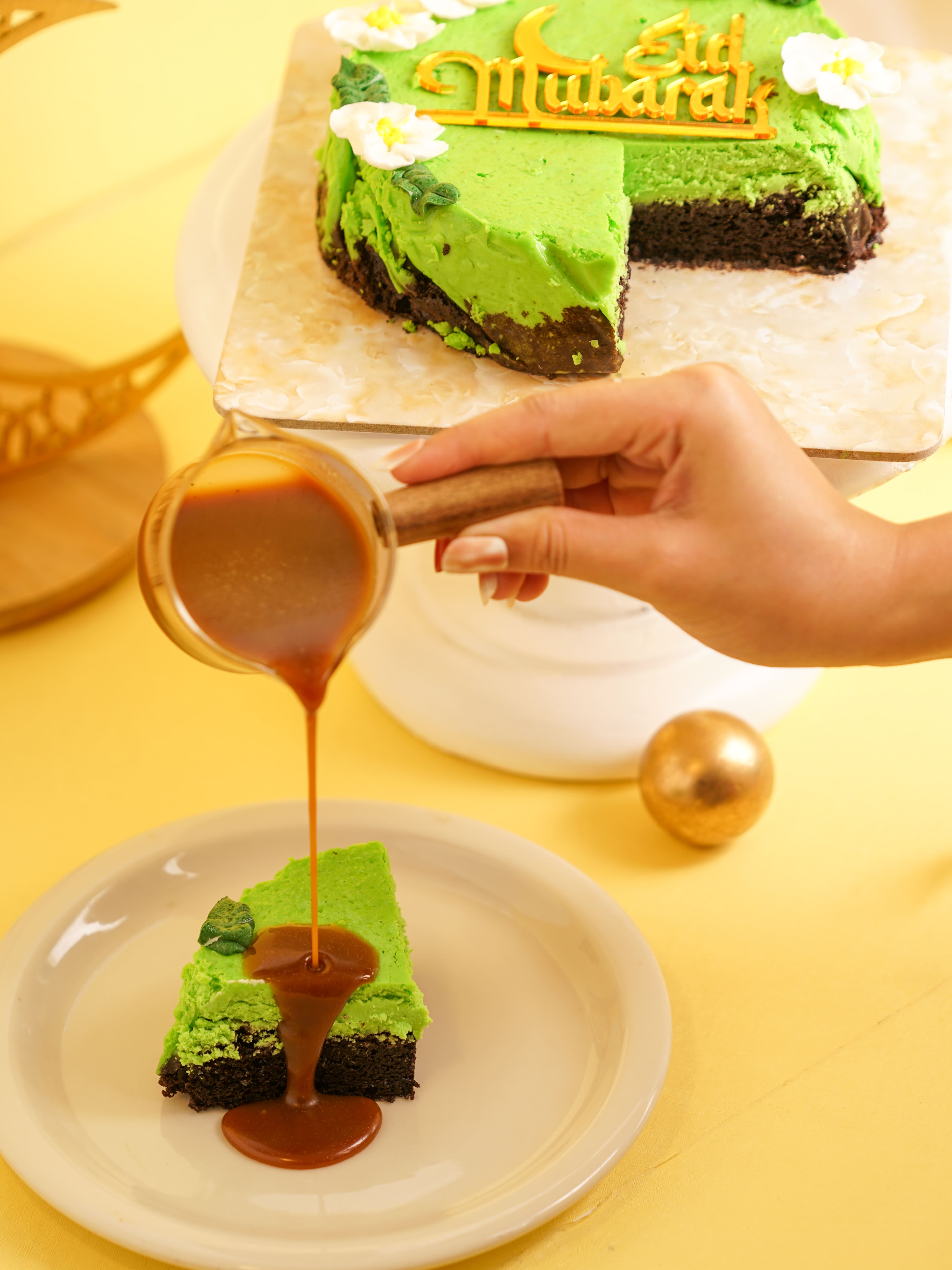 Cheesecake pandan lembut dengan sentuhan coklat dan saus gula aren yang hangat dan harum.